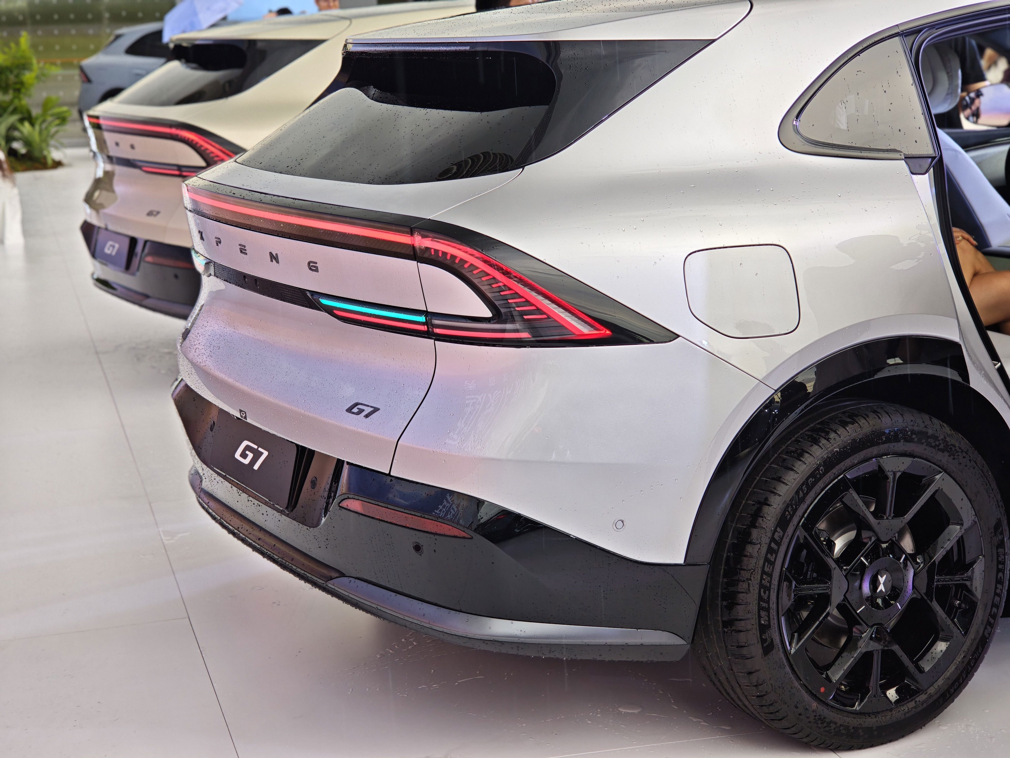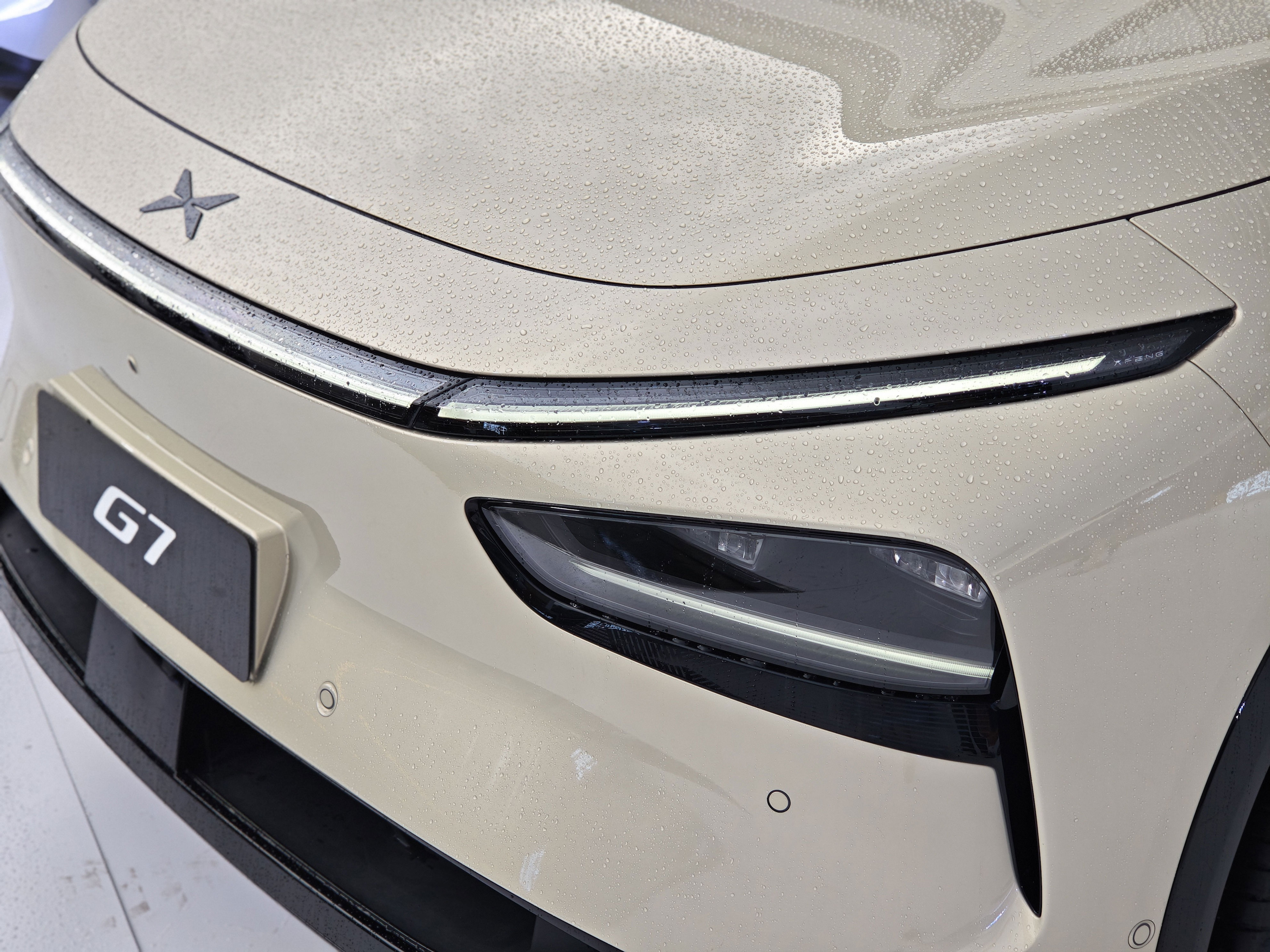 小鹏G7造型设计承袭小鹏最新家族基因,前脸采用封闭式格栅搭配分体式灯组系统,上方为标志性星环灯带,下方集成远近光灯组。车身侧面配备黑色外后视镜壳、隐藏式门把手及后窗隐私玻璃,车顶全景天幕为全系标配。整车尺寸达4892×1925×1655mm,轴距2890mm,提供星昼灰、新月银、星云白、暗夜黑、云贝米、星际绿六种外观配色方案。
